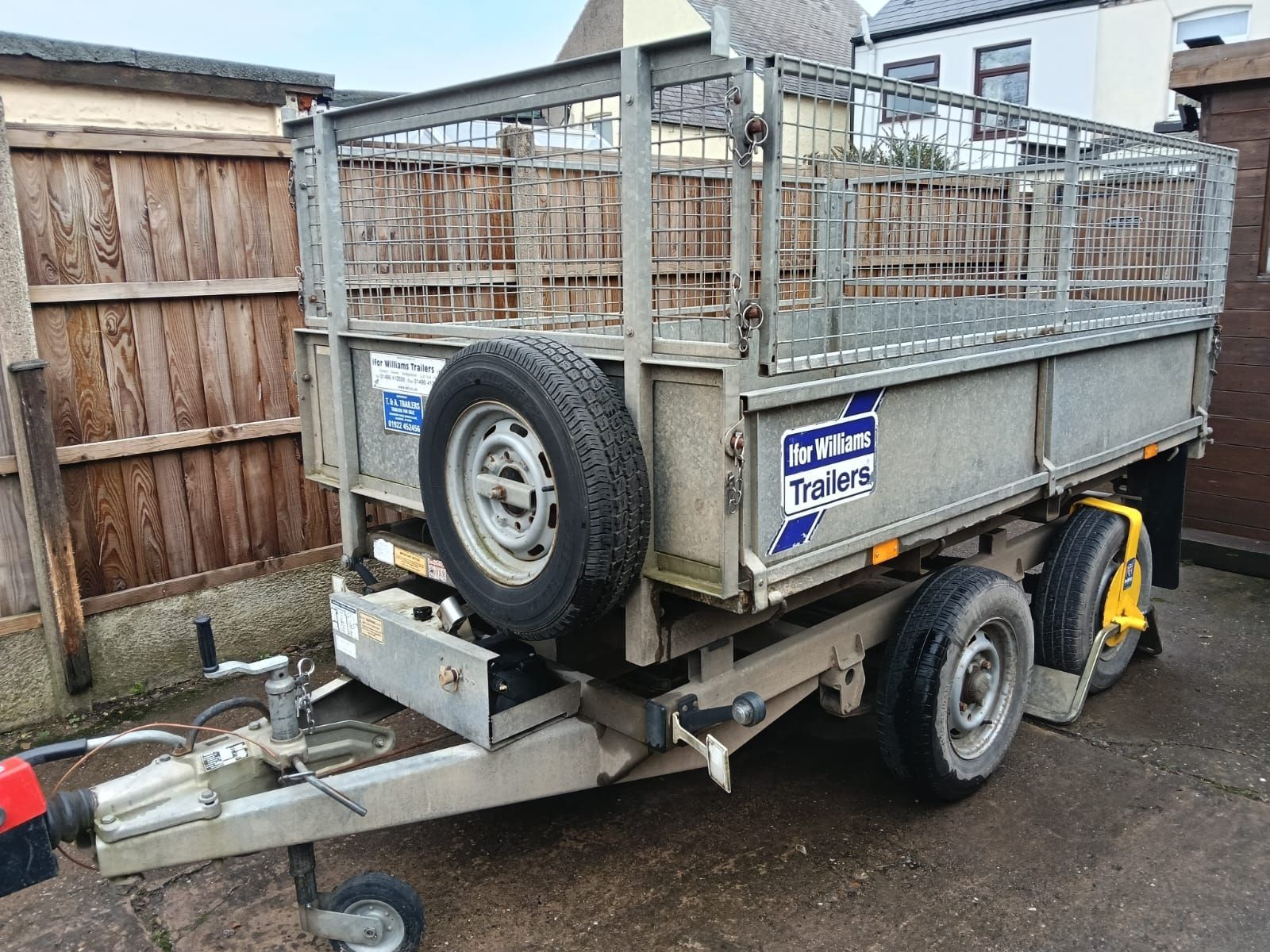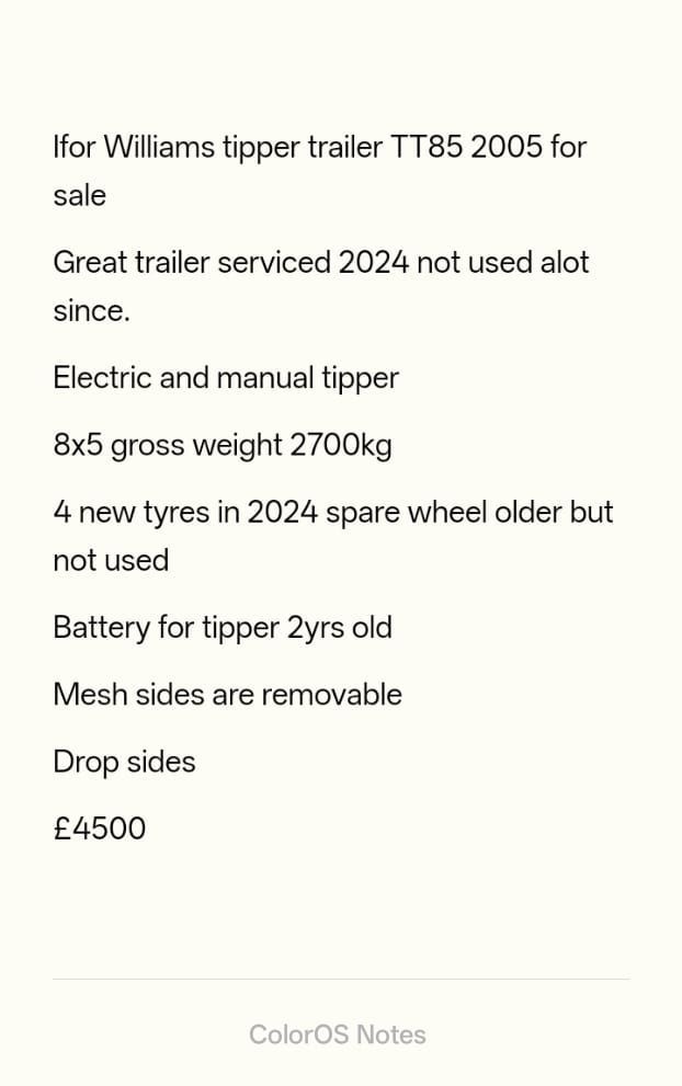 Ifor Williams Tipper TT85. 2005. Eletric and Manual Tipper. 8x5 Gross Weight 2700Kg. Serviced 2025 and not much use since. Four New Tyres, Mesh Side Removable and Drop Sides.
